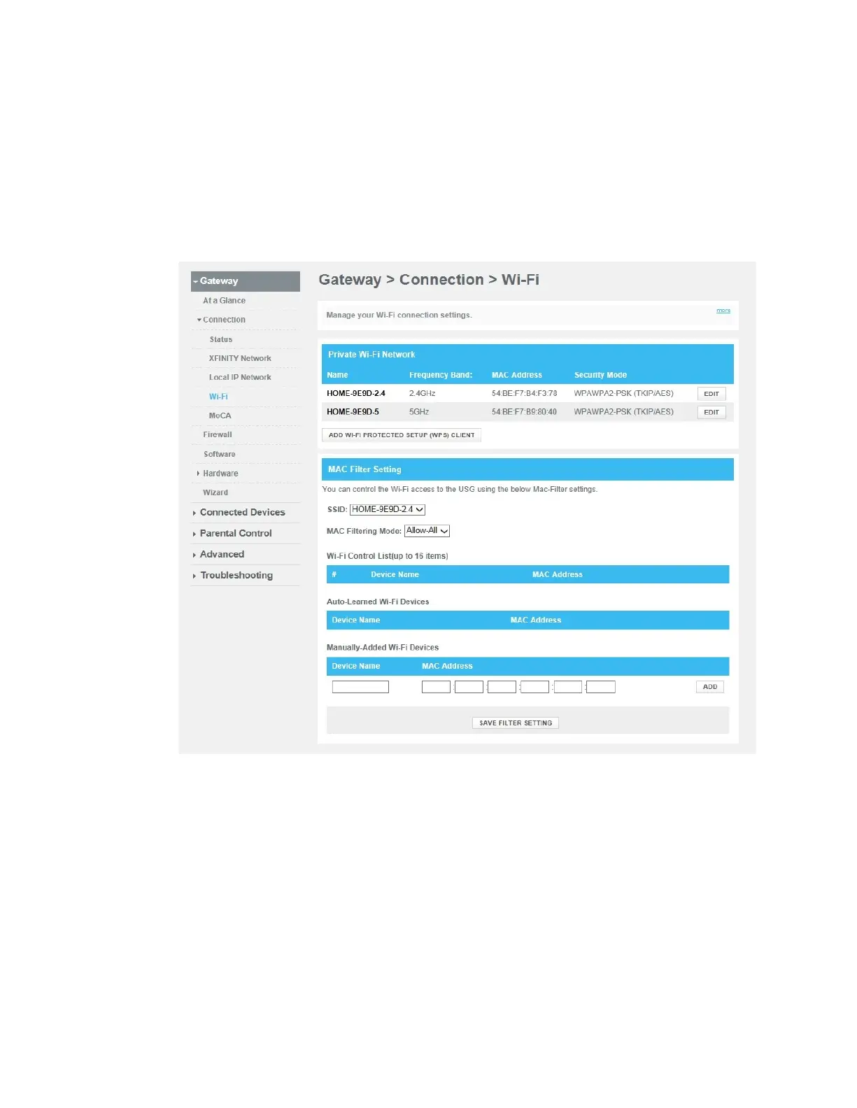 From the Gateway > Connection > WiFi page, click the Edit buttons in 2.4 GHz or