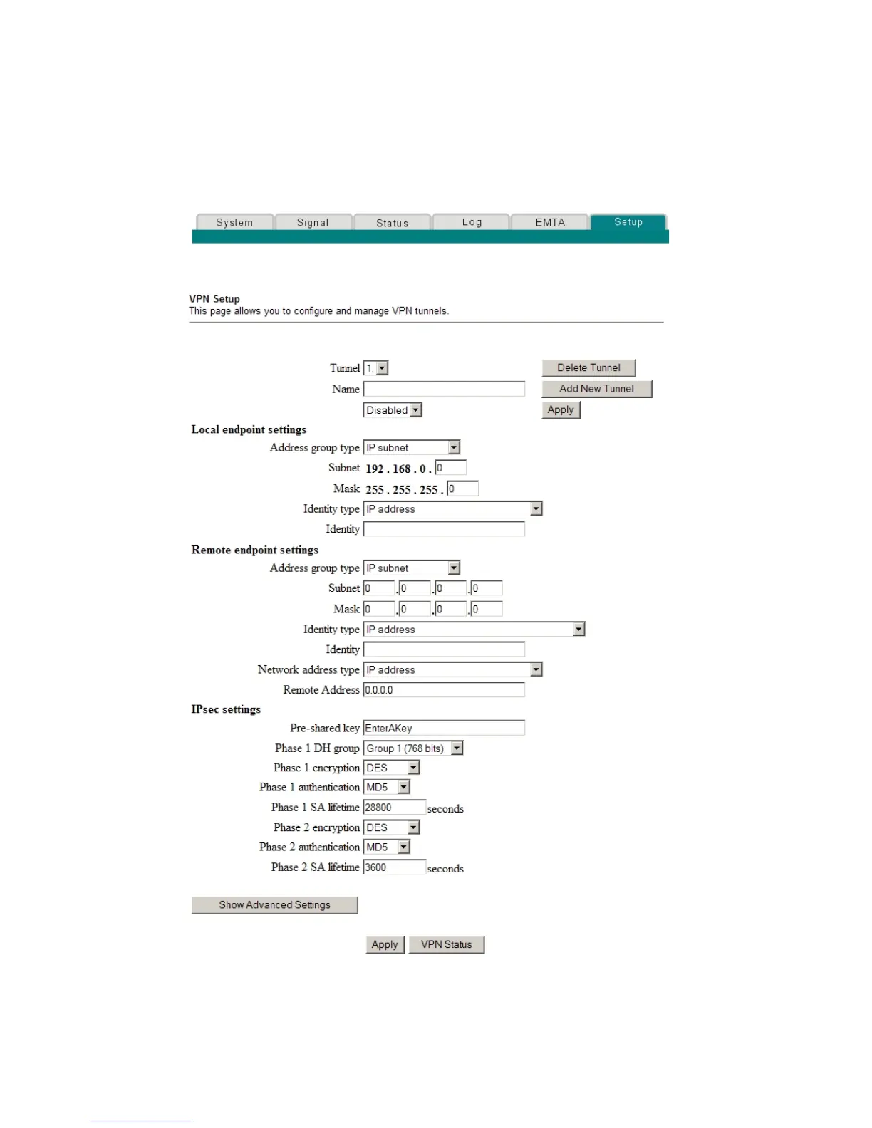 Termination - Status page. The VPN Setup page opens. The following illustration is