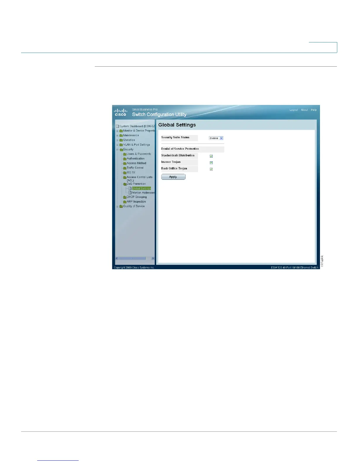 STEP 1 Click Security > DoS Prevention > Global Settings. The