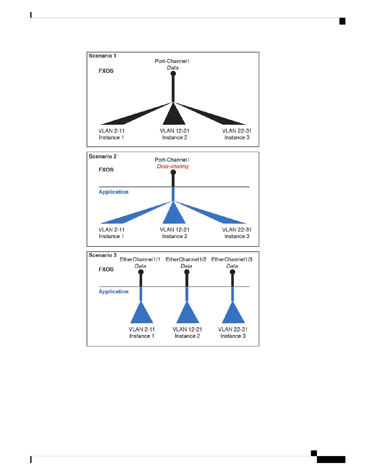 The following example creates 3 subinterfaces on Ethernet 1/1, and sets them to be data-sharing