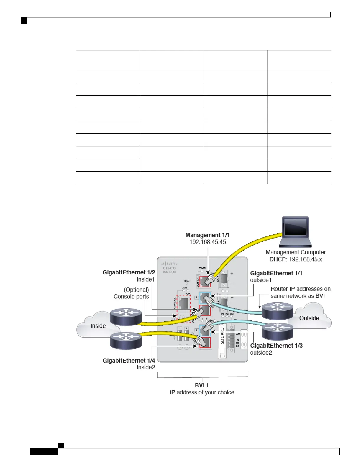 • Connect GigabitEthernet 1/1 to an outside router, and GigabitEthernet 1/2 to an inside router.