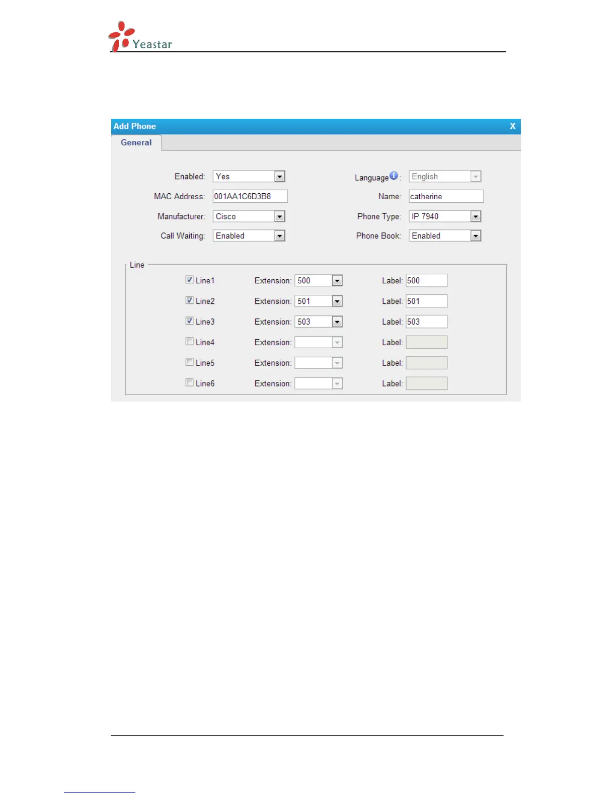 Input IP Phone’s MAC address, configure Name, Call waiting, Line, Extension,