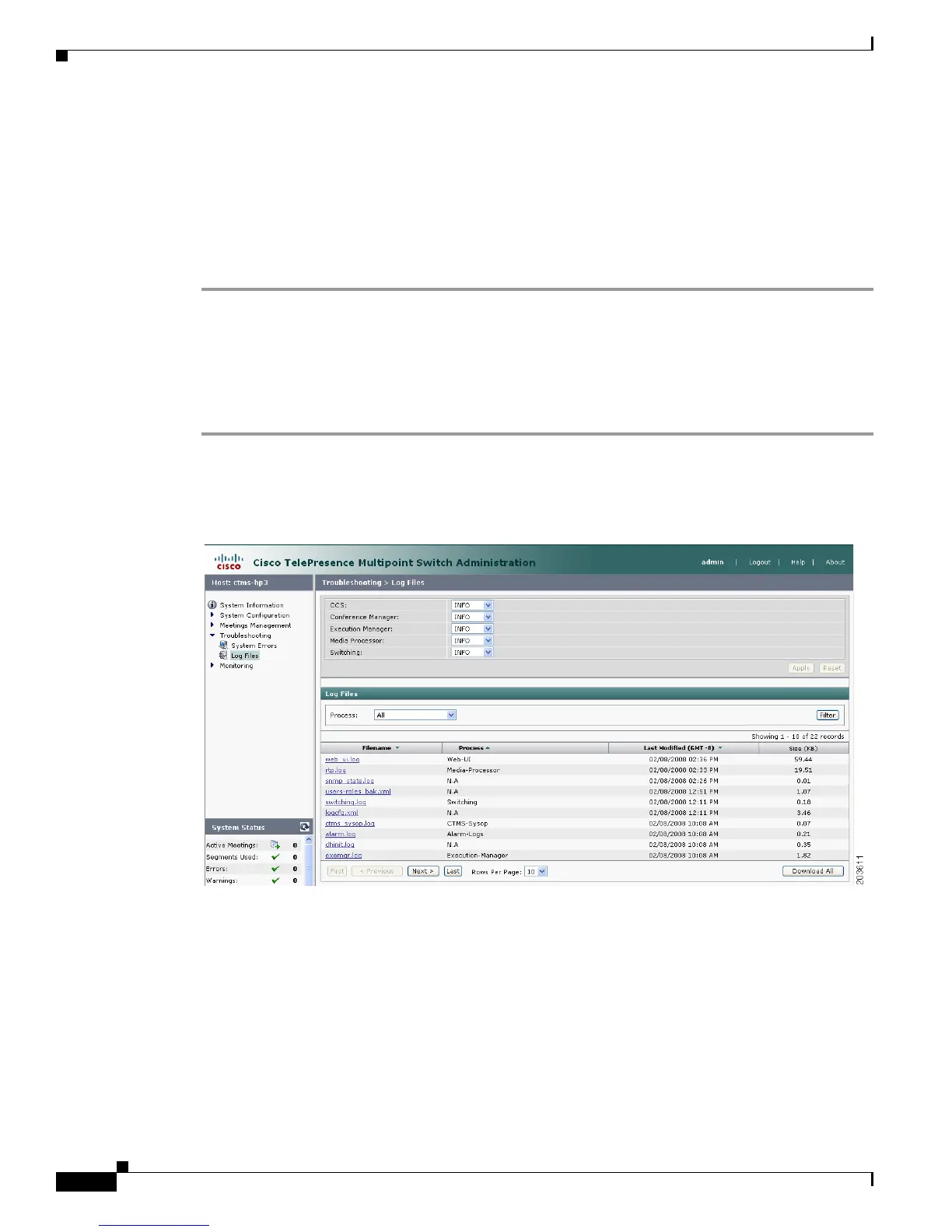 Step 2 At the top of the Log Files screen, there is a table listing the following CTMS system processes: