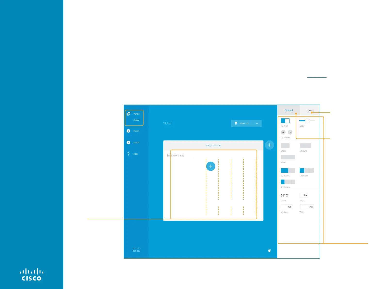 The in-room control editor. Widgets from the widget library are placed in a four-column grid.