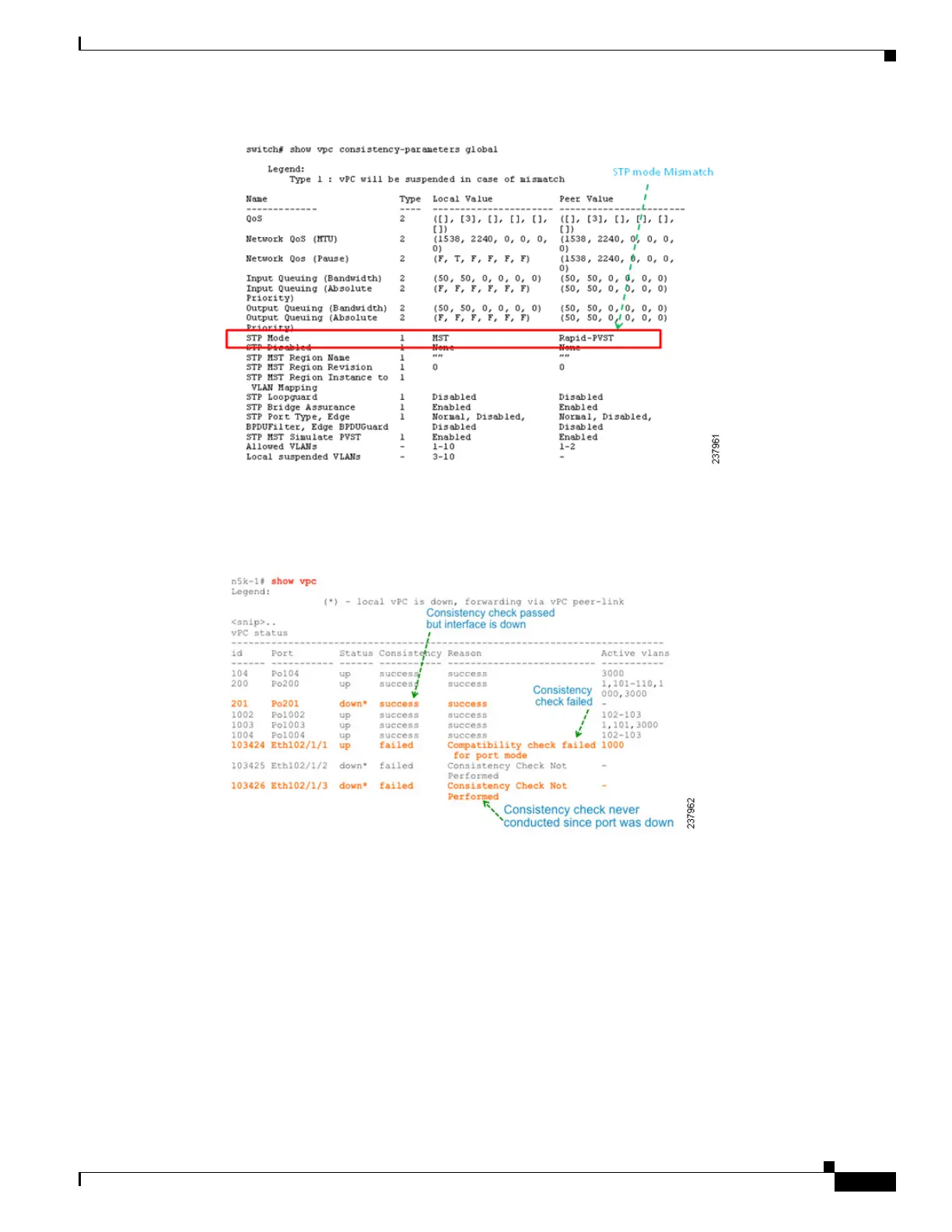 You can use the show vpc command also shows the vPC consistency check result for each vPC and the
