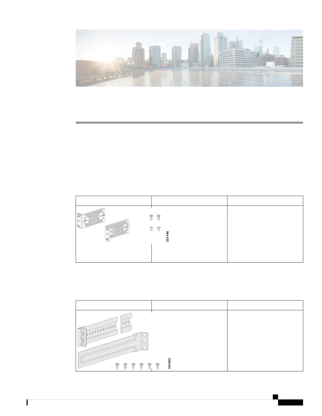 The following table lists and illustrates the contents for the 1RU rack-mount kit (NXK-ACC-KIT-1RU).