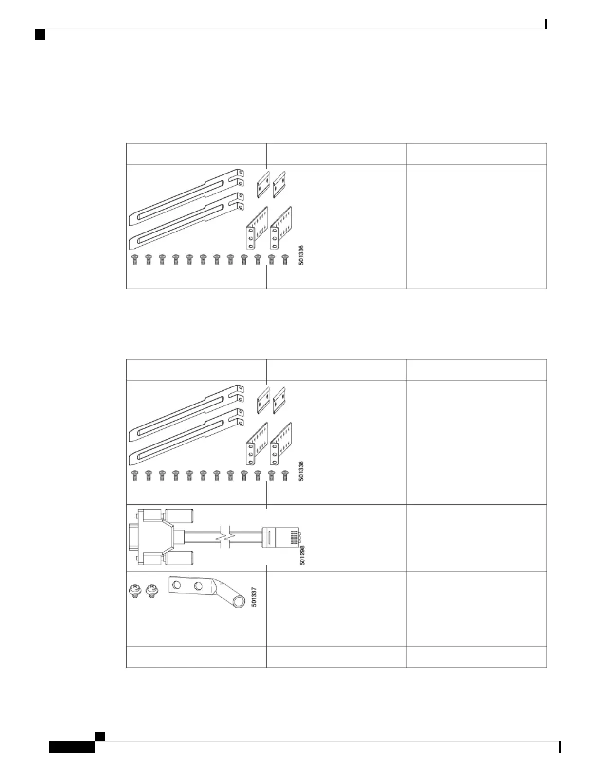 The following table lists and illustrates the contents for the 1RU rack-mount kit (N3K-C3064-ACC-KIT).