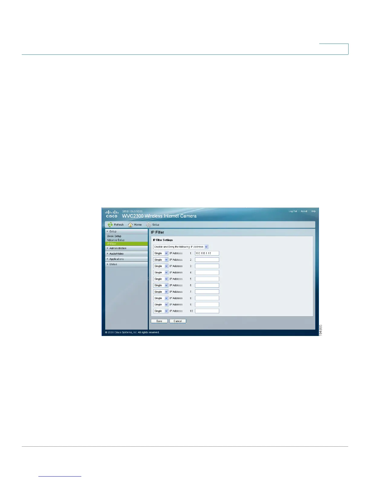 From the Setup > IP Filter window, you can configure IP Filter Settings to deny or
