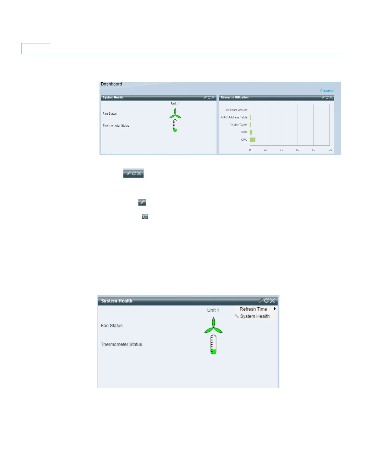 • Fan Status—Yellow if one fan failed and is backed up by the redundant fan; Green if