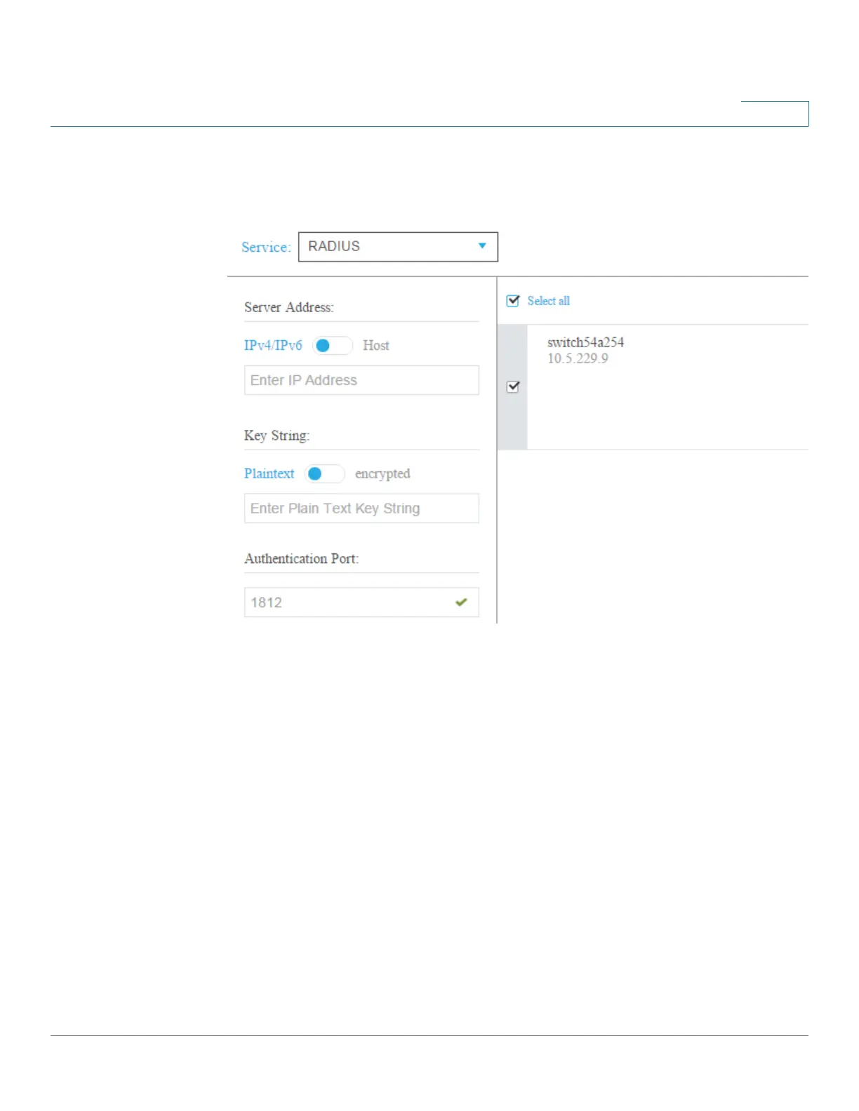For every selected device, the current configuration displays the RADIUS server with usage