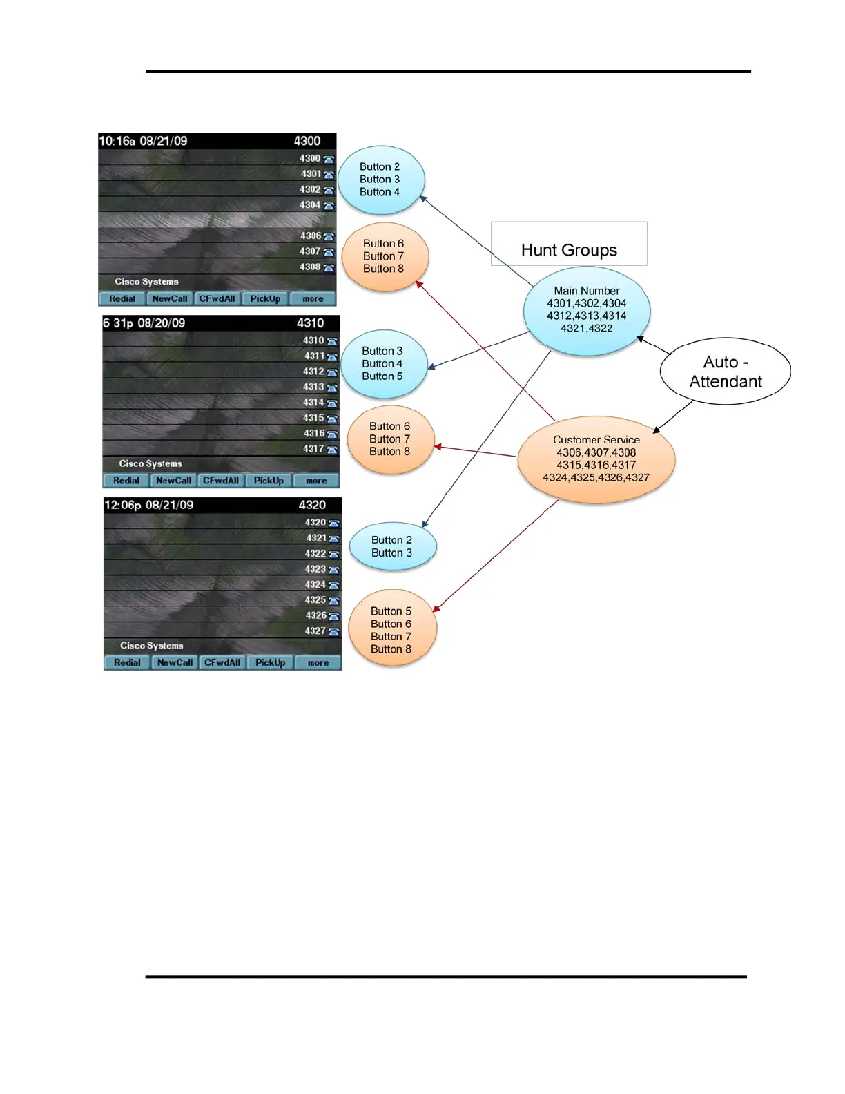 Customer Service hunt group has ten directory numbers from the operator IP Phones.