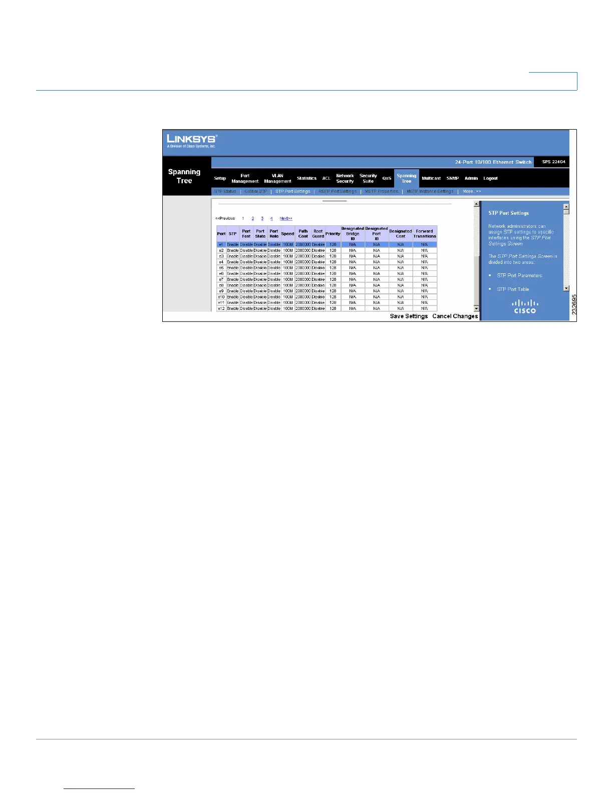 For 24-port devices, the STP Port Table displays the interfaces on multiple