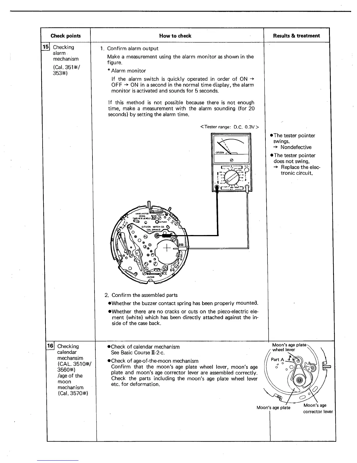 Citizen 3530A - Checking alarm mechanism; Checking calendar mechanism; age of the moon mechanism