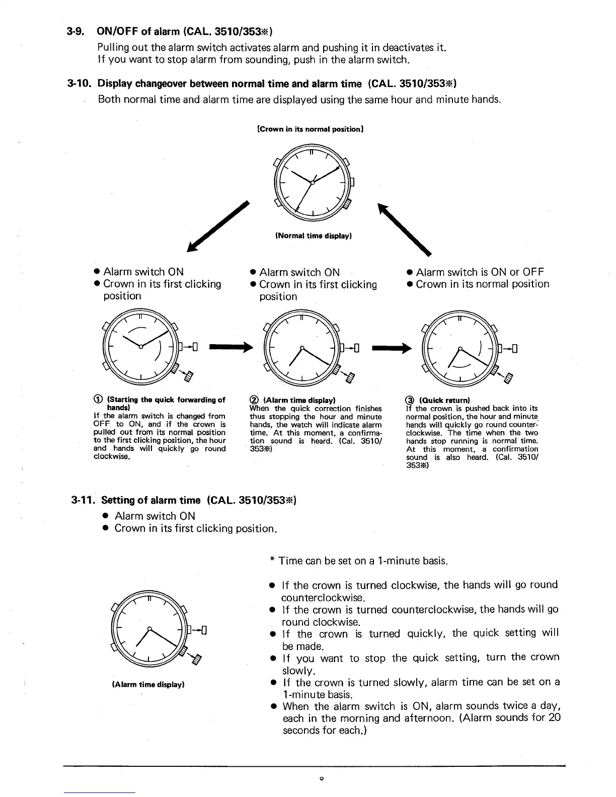 Citizen 3530A - ON;OFF of alarm; Display changeover between normal time and alarm time; Setting of alarm time