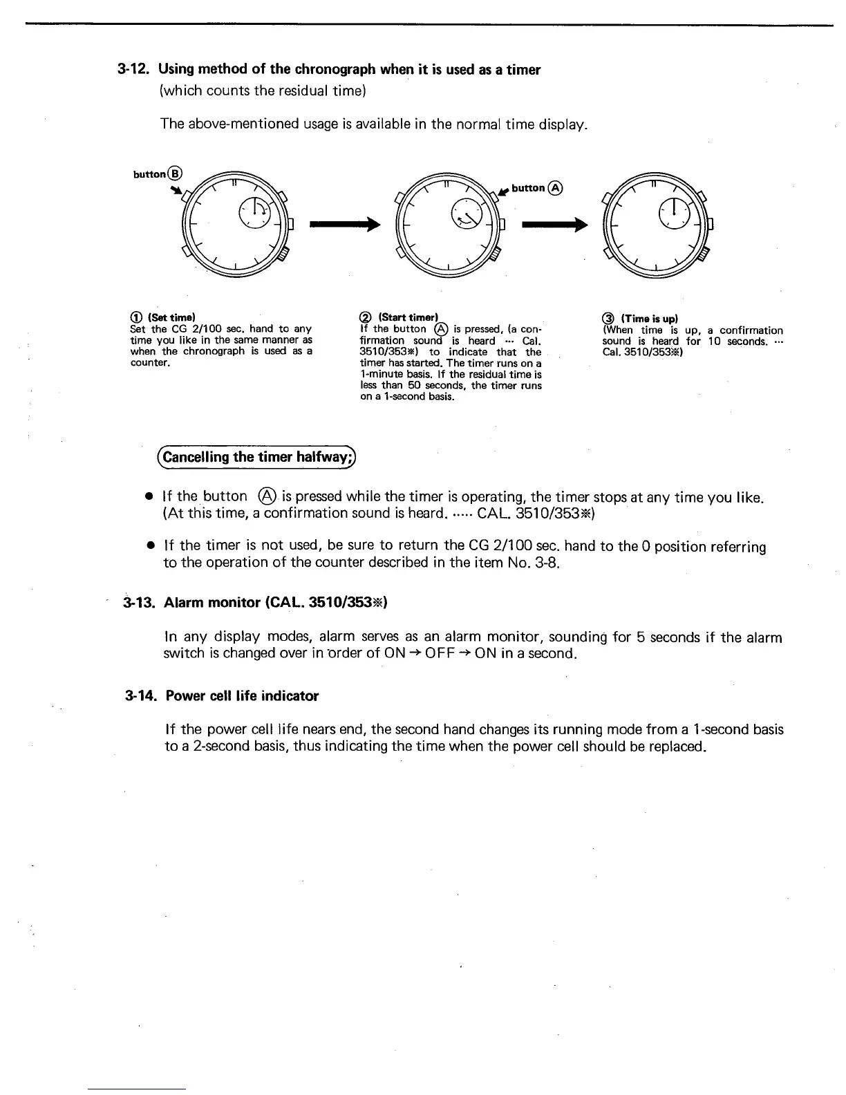 Citizen 3530A - Using method of the chronograph when it is used as a timer; Alarm monitor; Power cell life indicator
