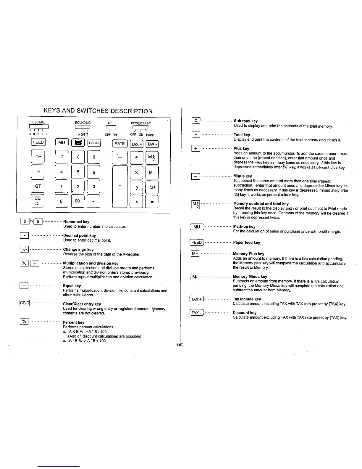 Citizen 520DP - KEYS AND SWITCHES DESCRIPTION; Core Operation Keys; Memory, Tax, and Currency Keys