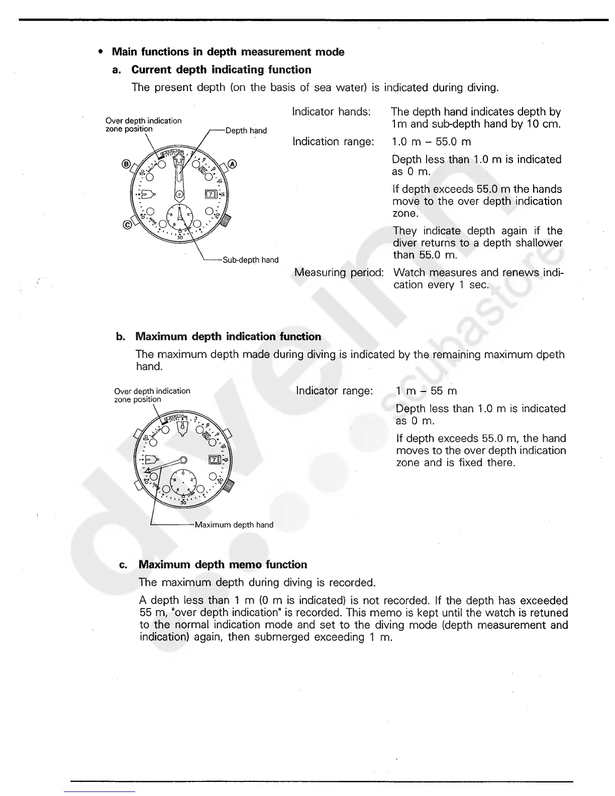 Citizen 5810 - Main Functions in Depth Measurement Mode; Current Depth Indicating Function; Maximum Depth Indication Function; Maximum Depth Memo Function
