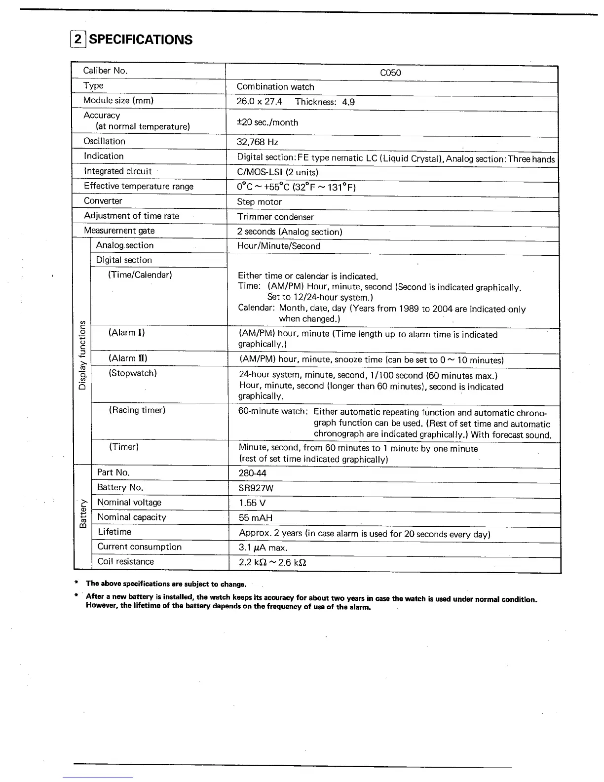 Citizen C050 - 2 SPECIFICATIONS; Caliber C050 Specifications