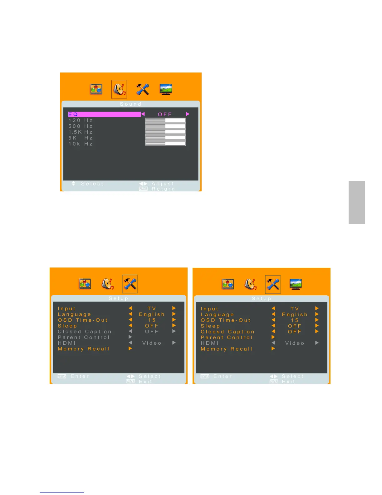 Language: To select a OSD language from English, French or Spanish.