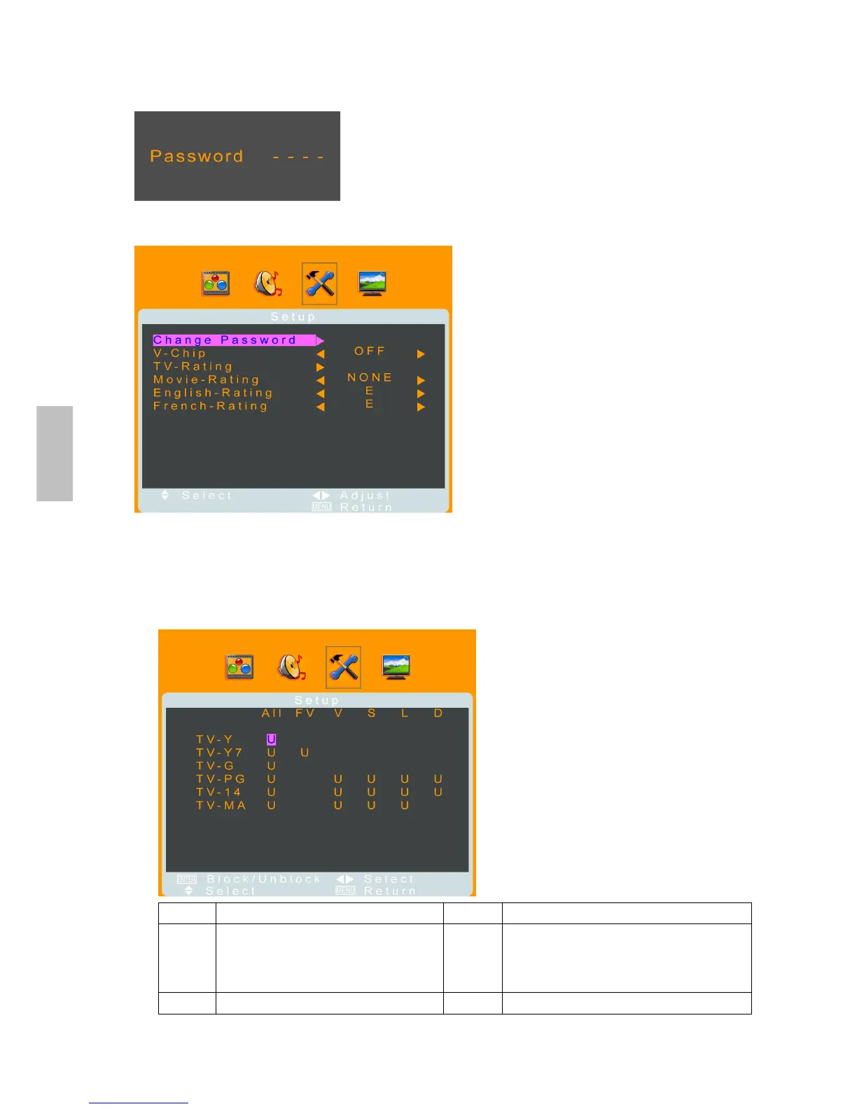 Use ENTER button to block or unblock the ratings, and use MENU to exit.