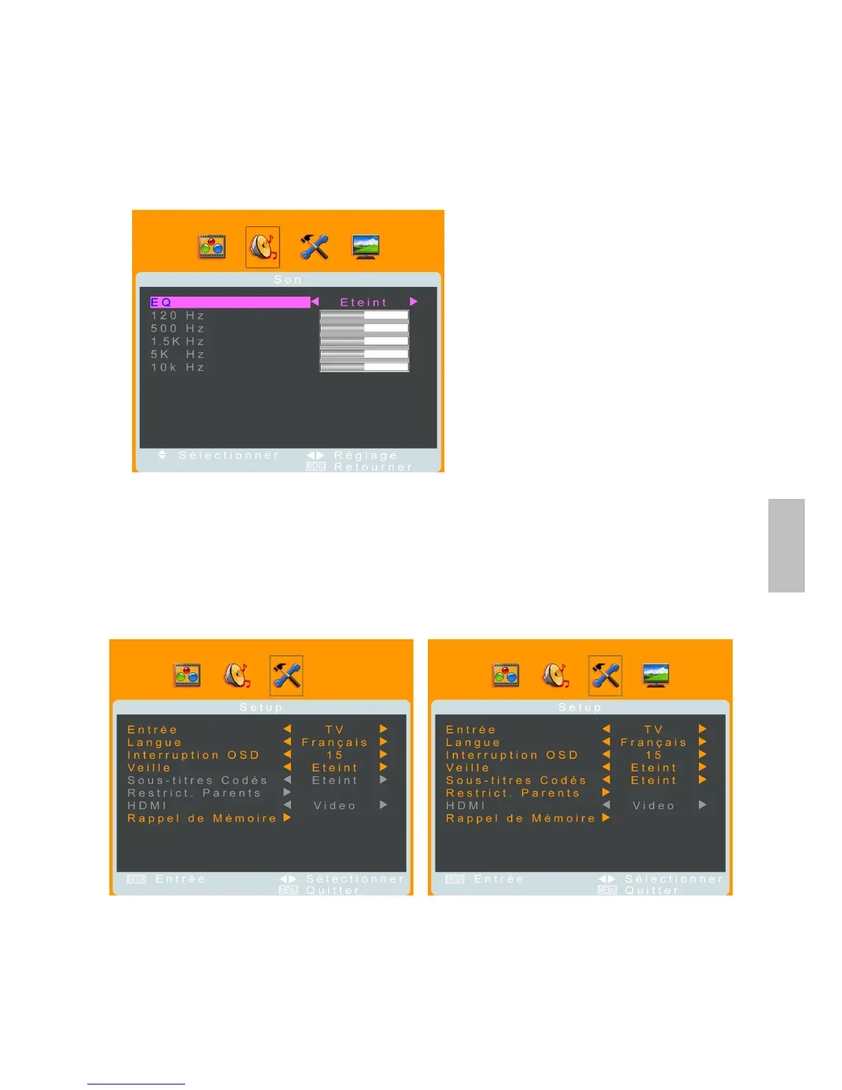 Son grave : Pour régler les sons graves (Actif seulement quand le son est en mode