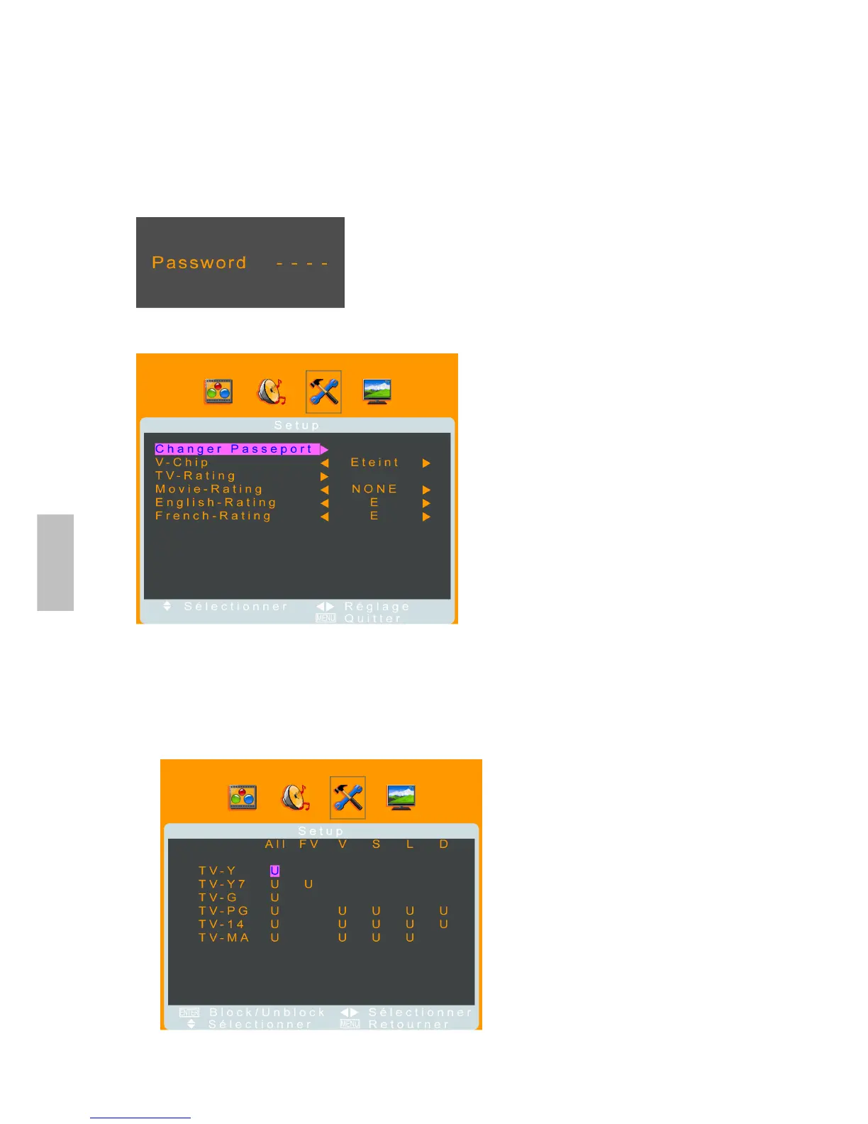 Pour activer les fonctions V-Chip veuillez saisir “0000” si vous n'avez pas attribué de mot de