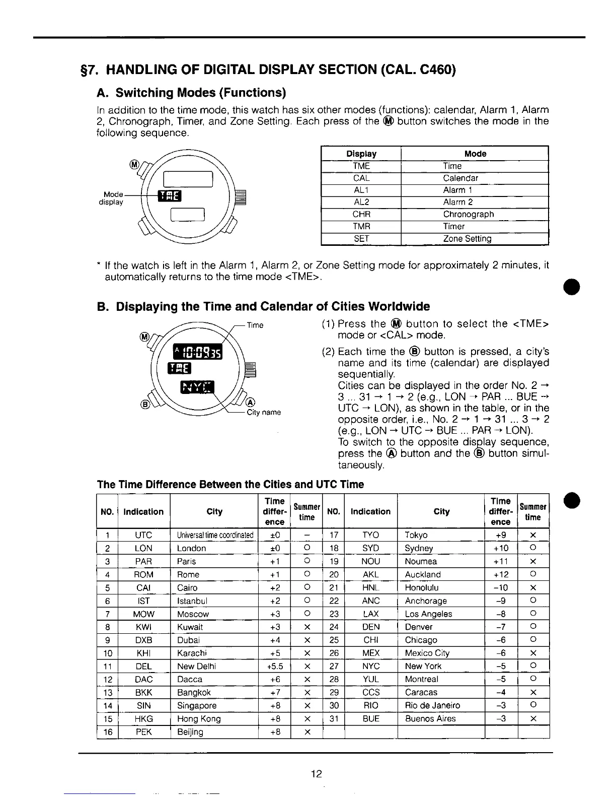 Citizen C450 - Handling of Digital Display Section (CAL. C460); Switching Modes (Functions); Displaying the Time and Calendar of Cities Worldwide