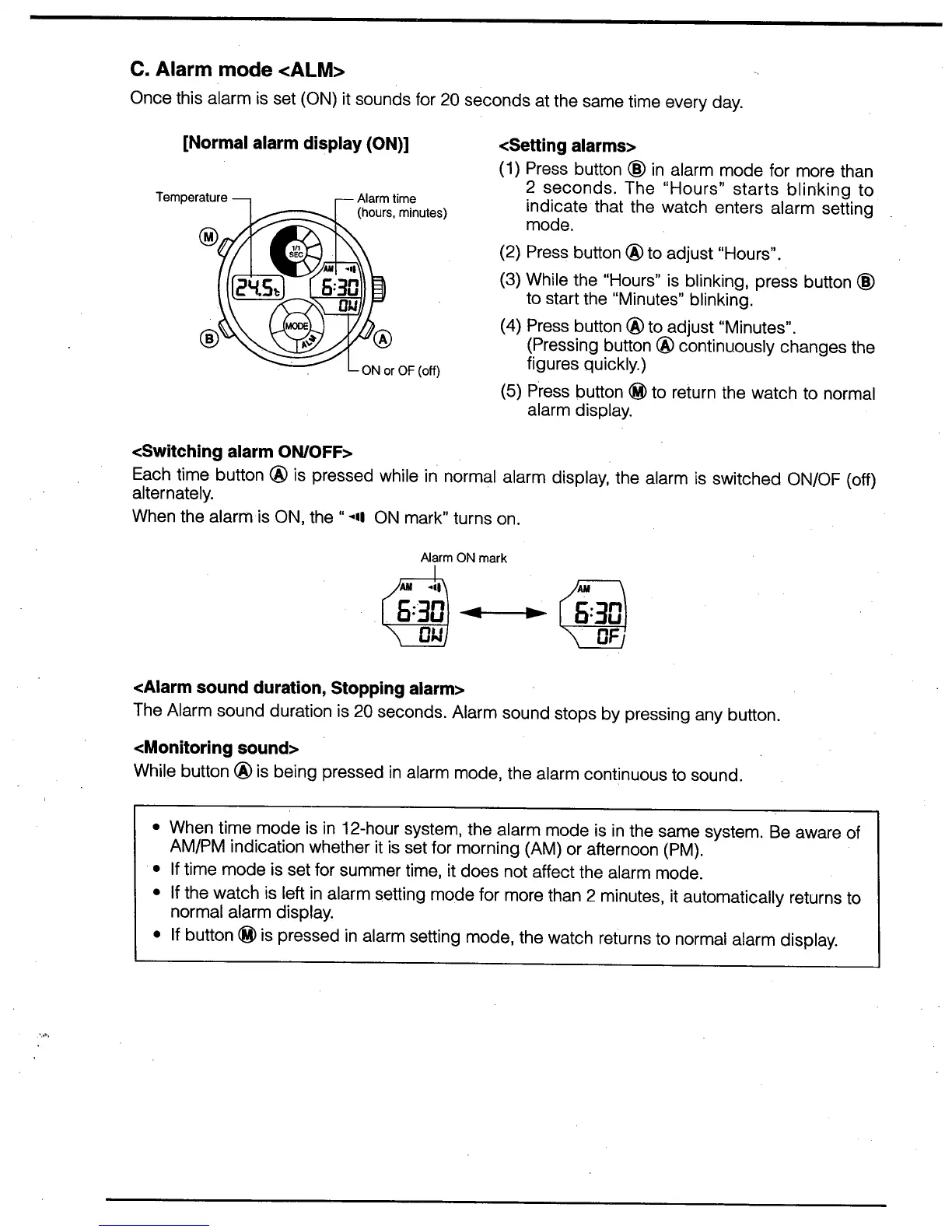 Citizen C710 - Alarm Mode; Switching Alarm On;Off; Alarm Sound Duration, Stopping Alarm; Monitoring Sound