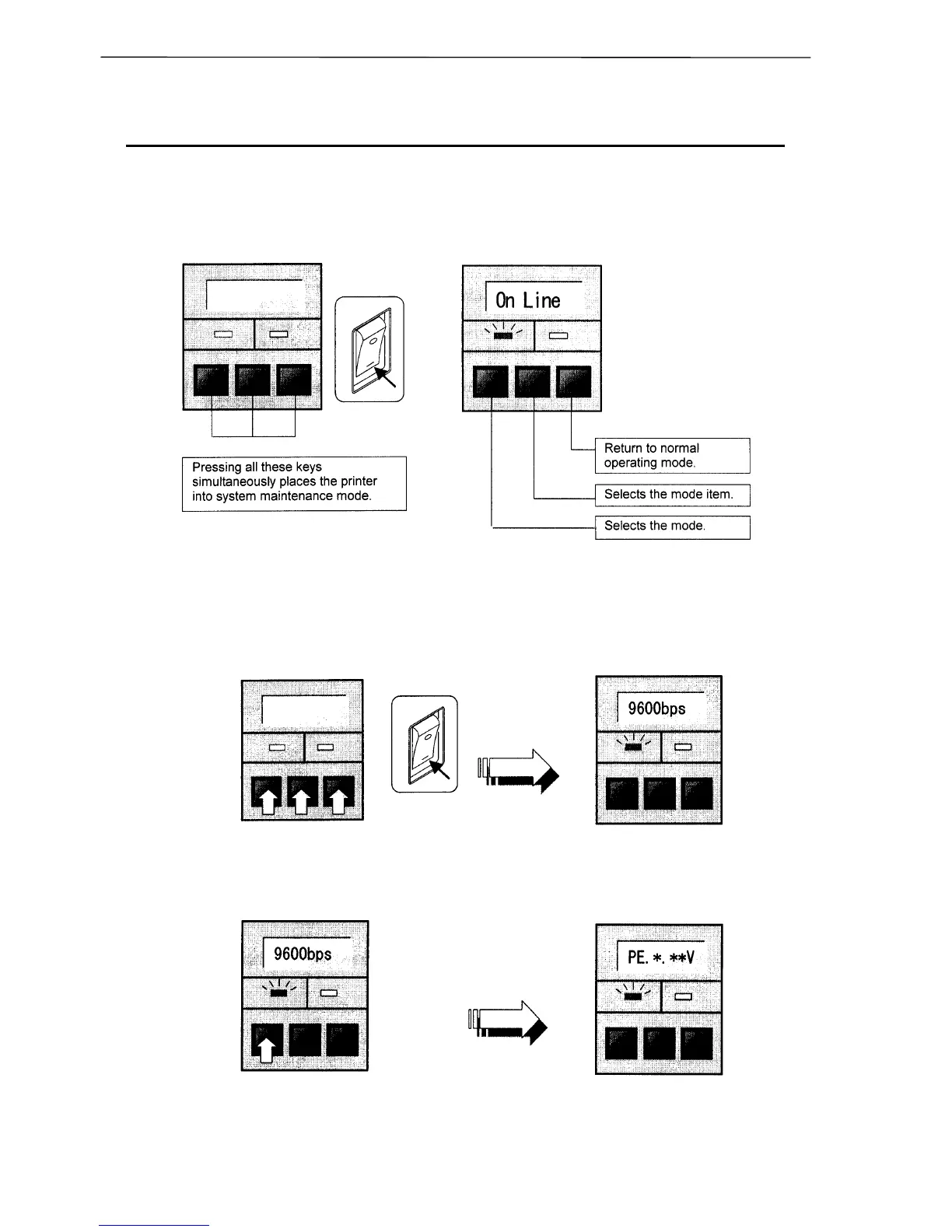 1. First turn OFF the power switch, then press and hold the PAUSE, FEED and STOP keys