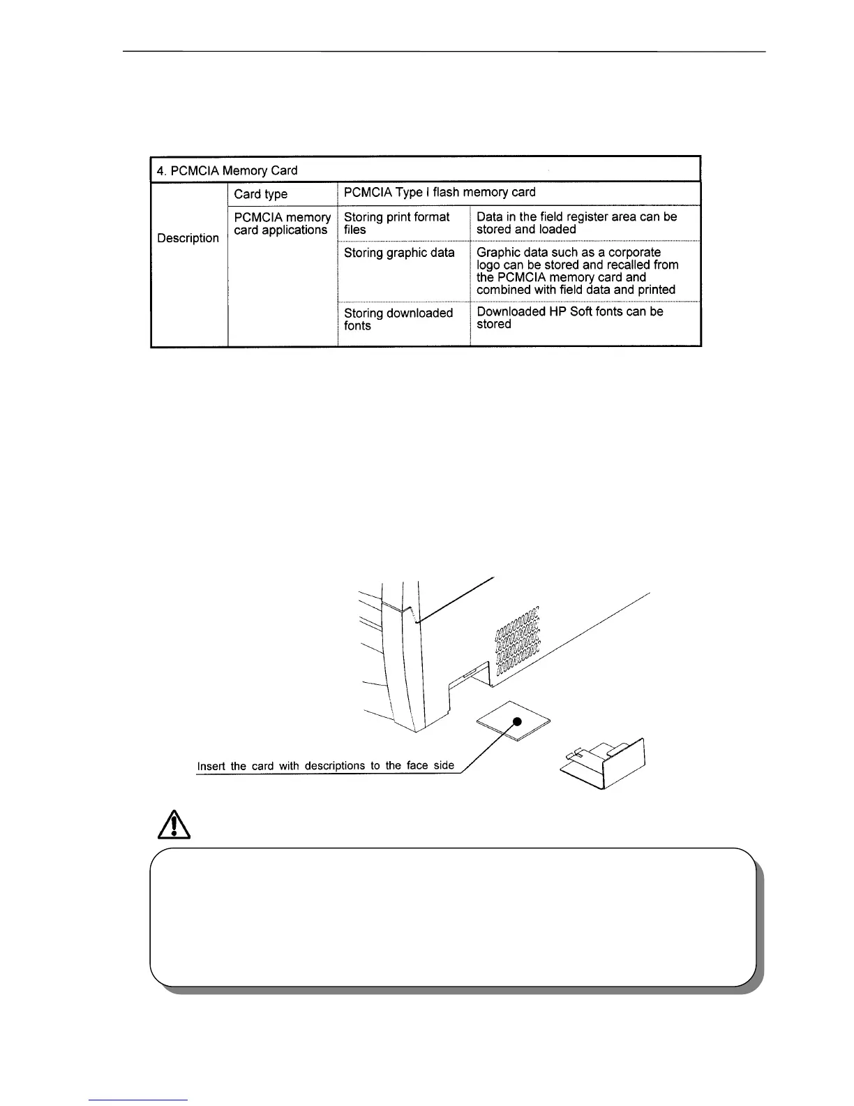 • Do not insert or remove the PCACIA memory card before the power to the printer is turned off.