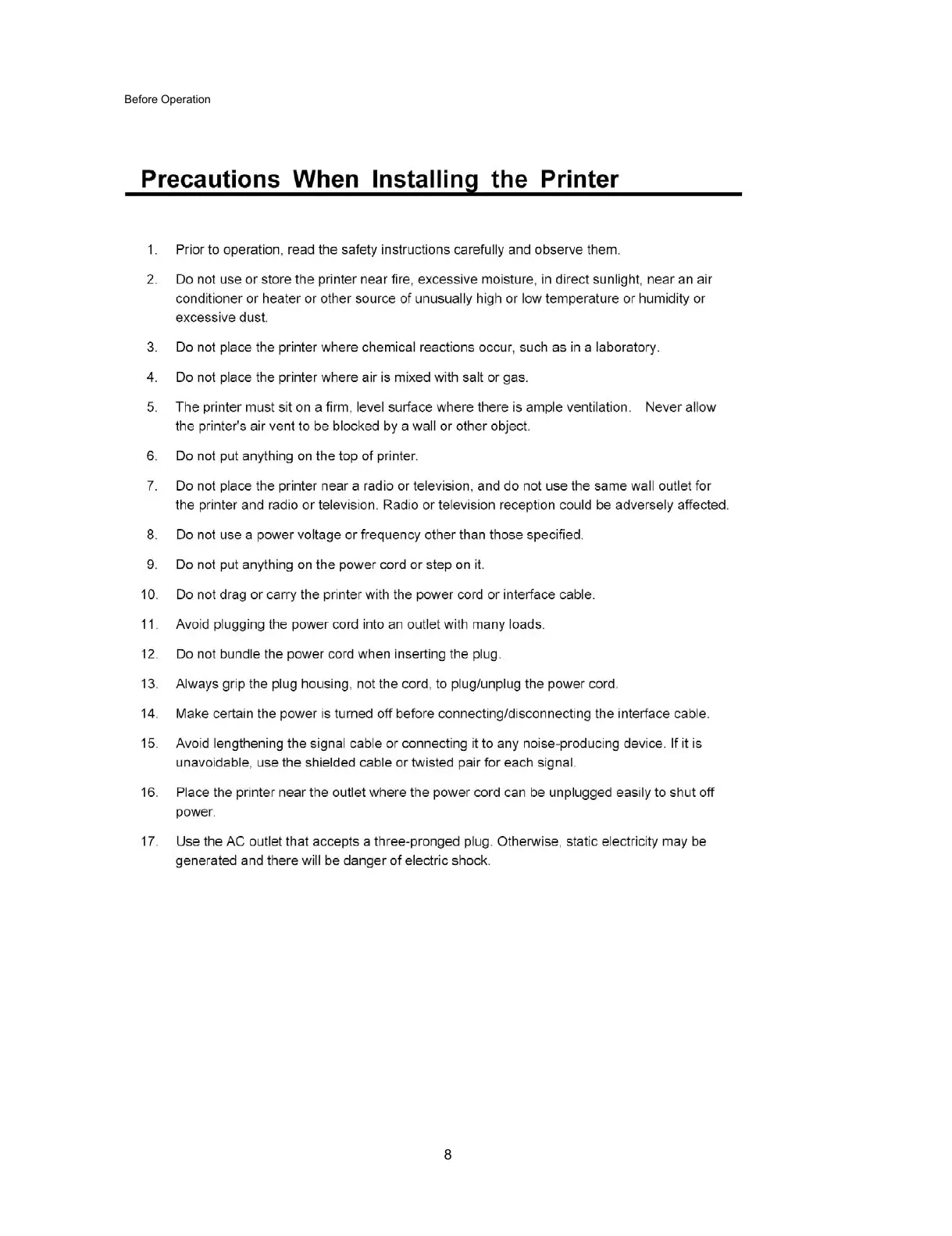 Citizen CLP-7401 - Precautions When Installing the Printer
