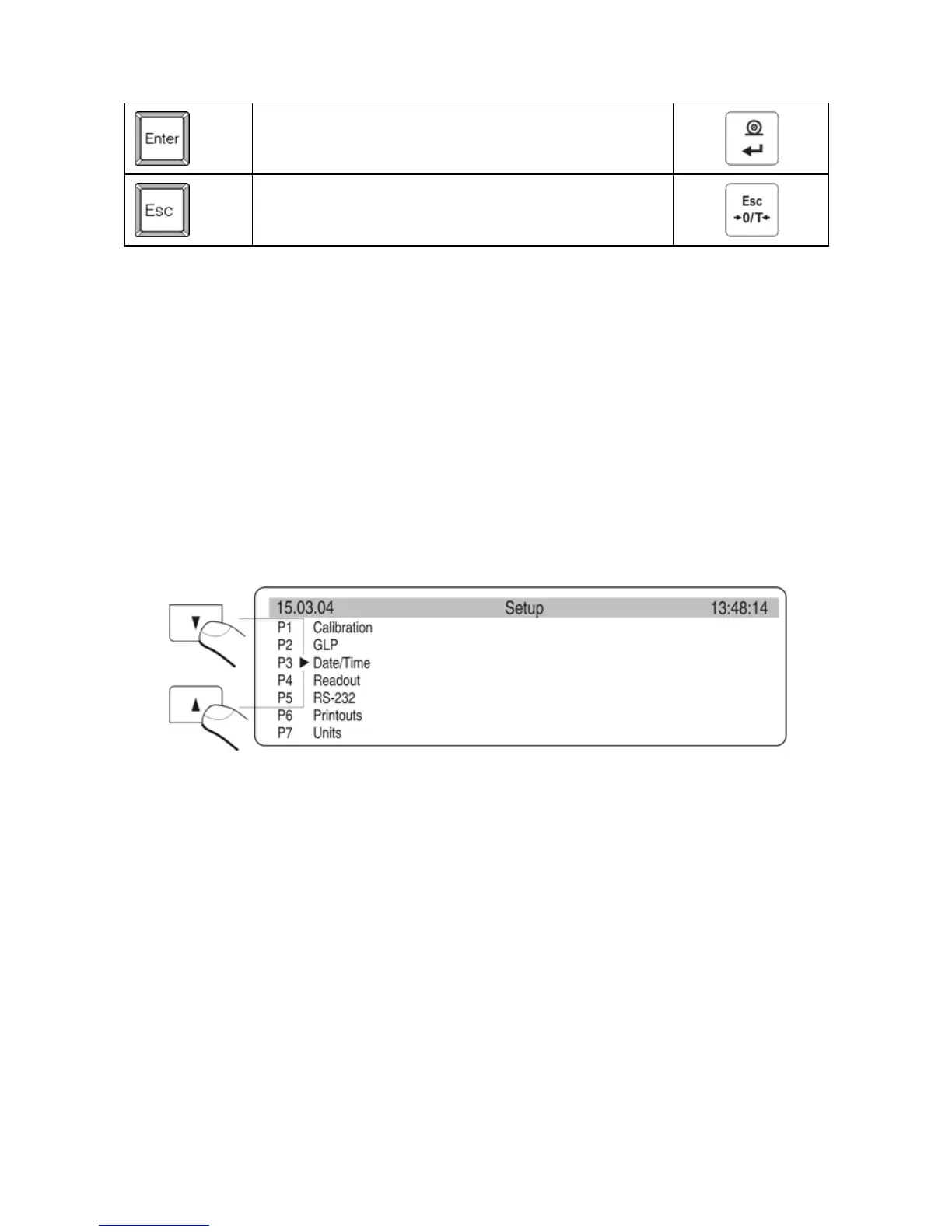 he menu is presented in p.5. Press the Setup key in weighing level. Main menu is