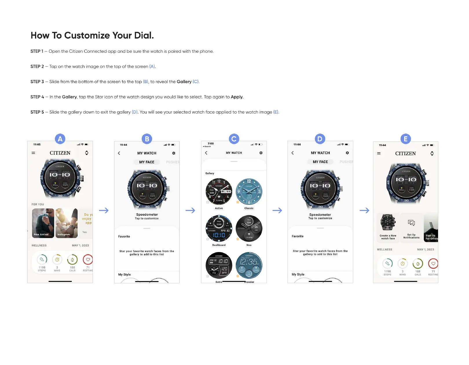 —Slide the gallery down to exit the gallery (D).You will see your selected watch face applied to the watch image (E).