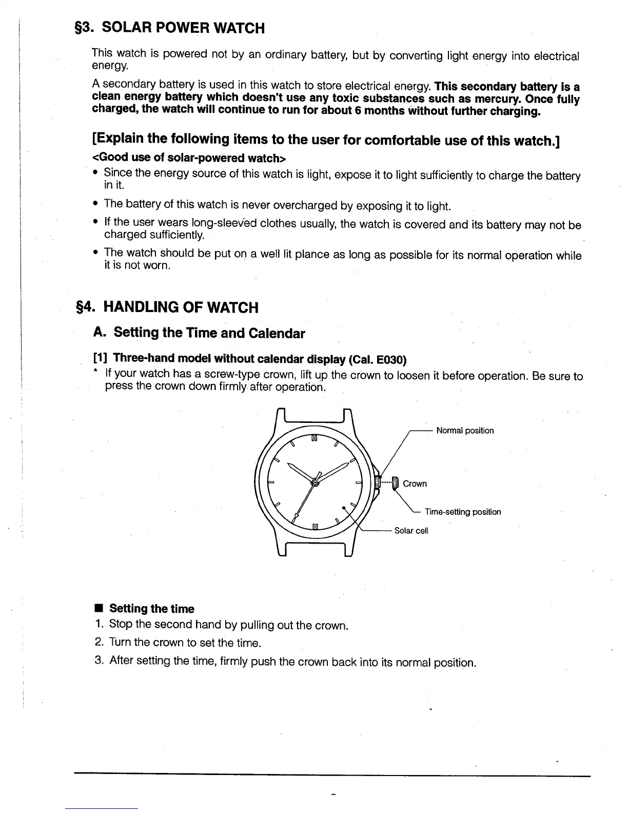 Citizen E030 - Solar Power Watch Operation; Handling of Watch; Setting Time and Calendar