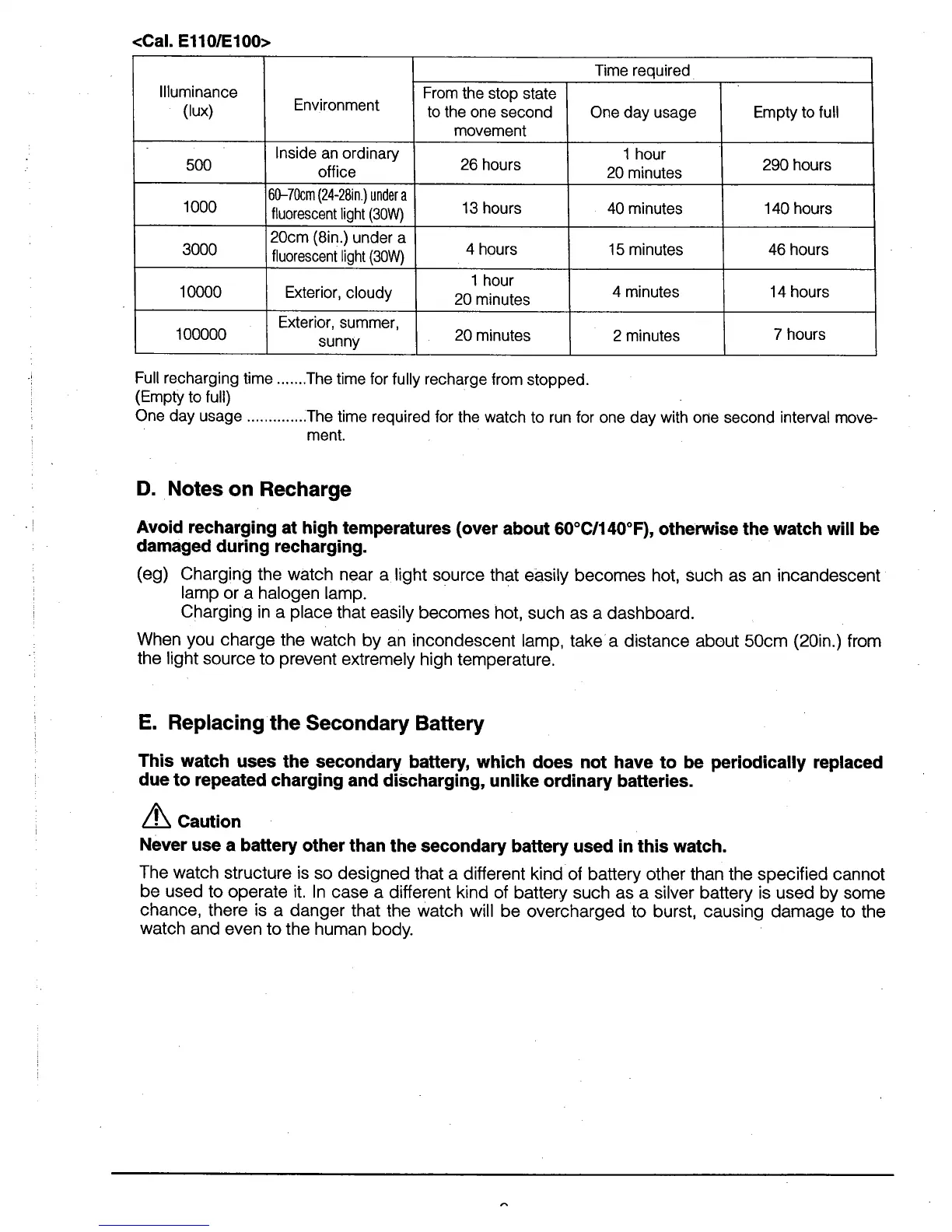 Citizen E030 - Recharge Precautions; Secondary Battery Replacement