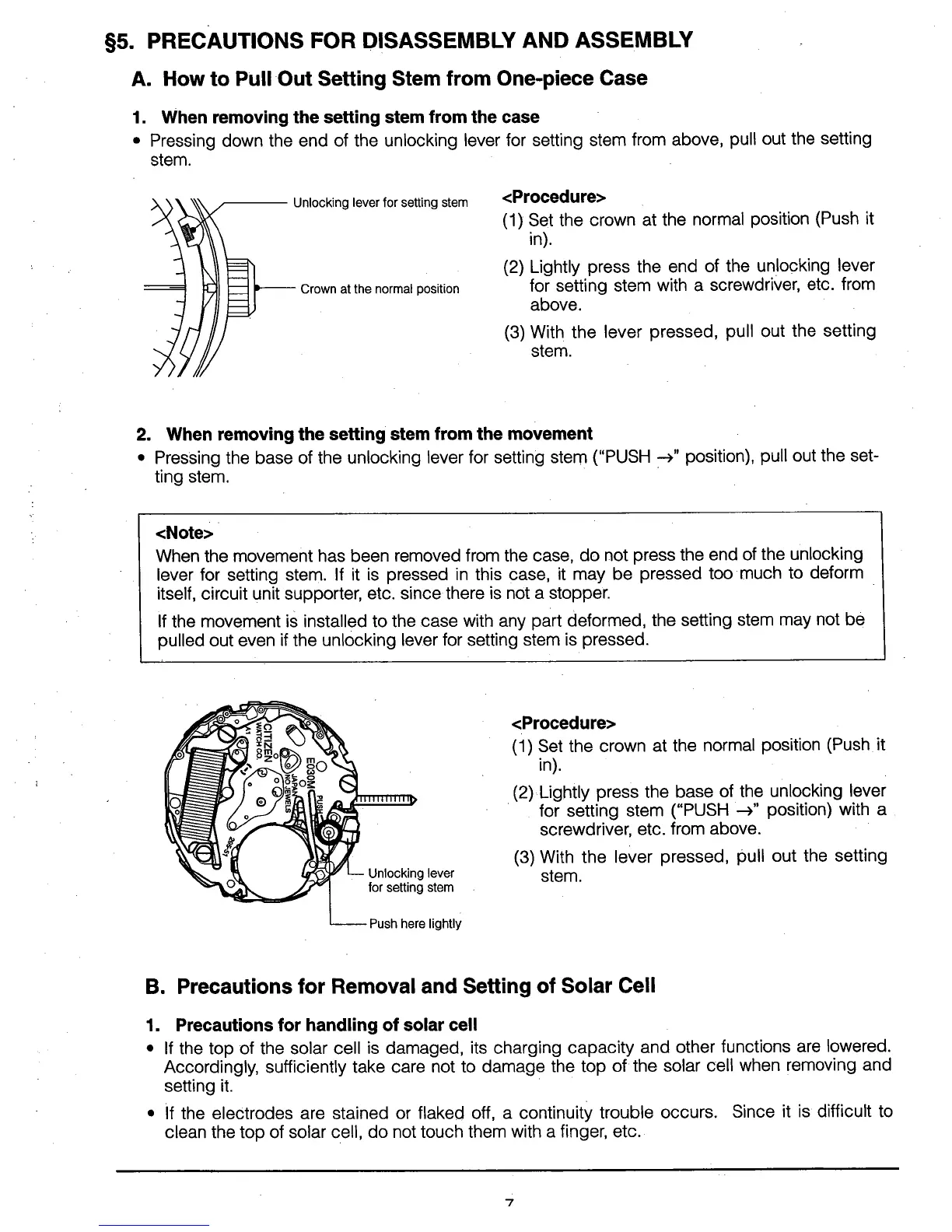 Citizen E030 - Disassembly and Assembly Precautions; Setting Stem Removal Procedure; Solar Cell Removal and Setting Precautions