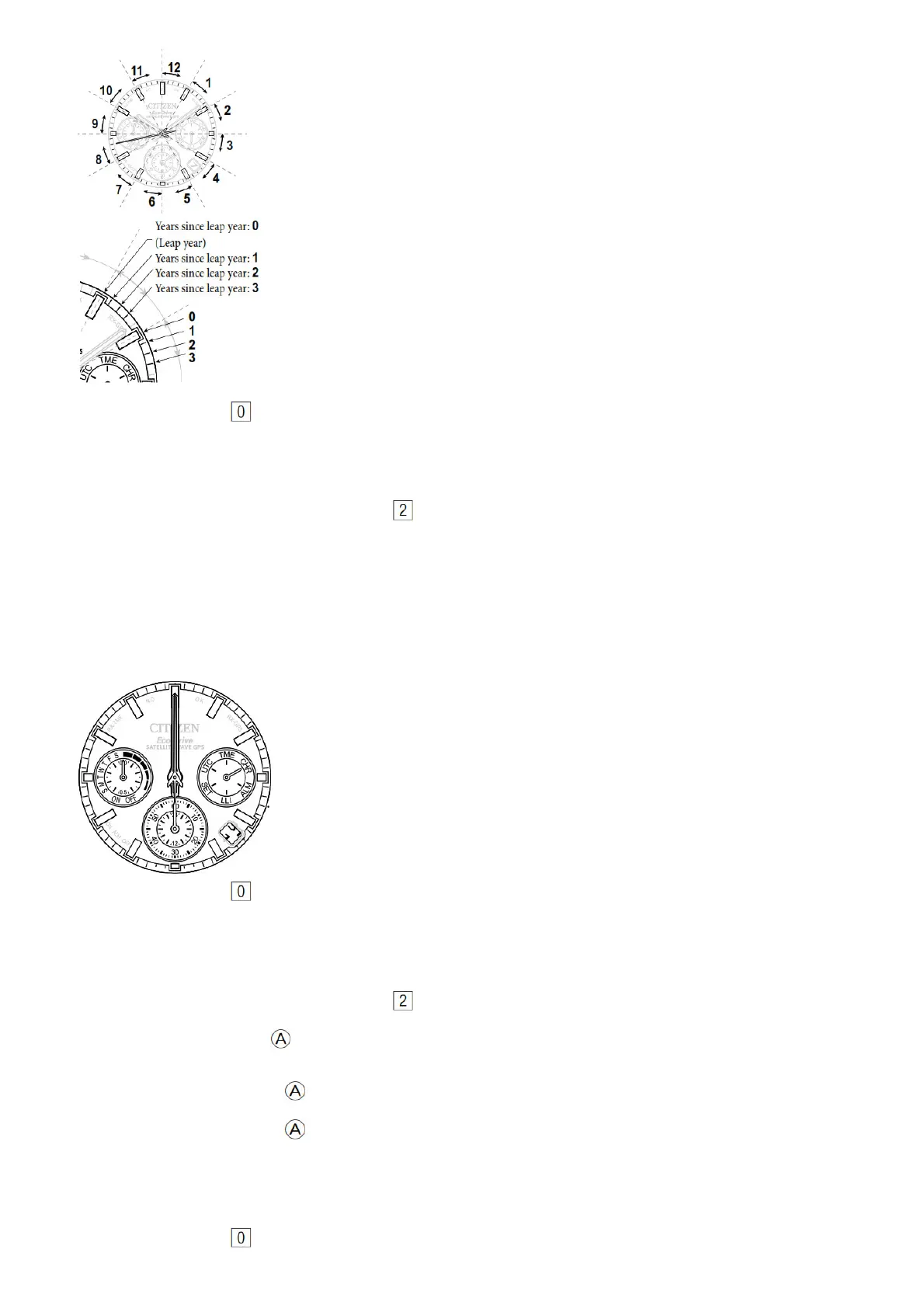 The year corresponds to the years since leap year and is indicated with the position of the second hand.