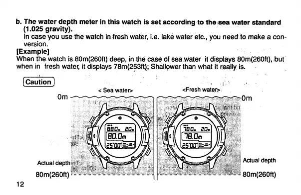 when in fresh water, it displays 78m(253ft); Shallower than what it really is.