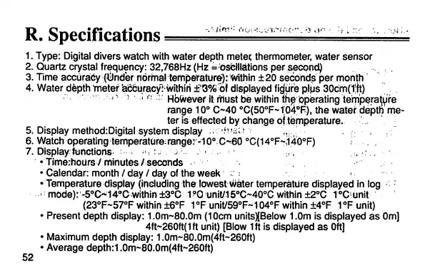 • Maximum depth display: 1.0m~80.0m(4ft~260ft)
