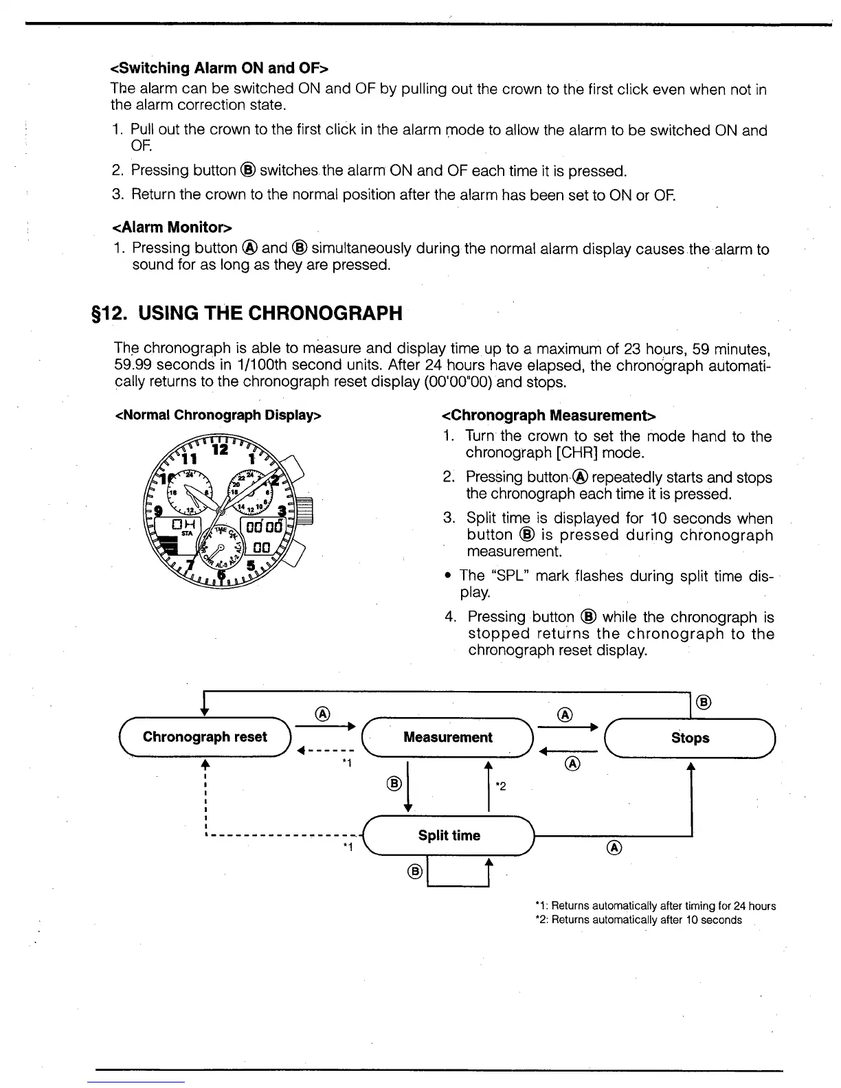 Citizen Quartz C650 - Using the Chronograph; Switching the Alarm on and off; Normal Chronograph Display; Chronograph Measurement