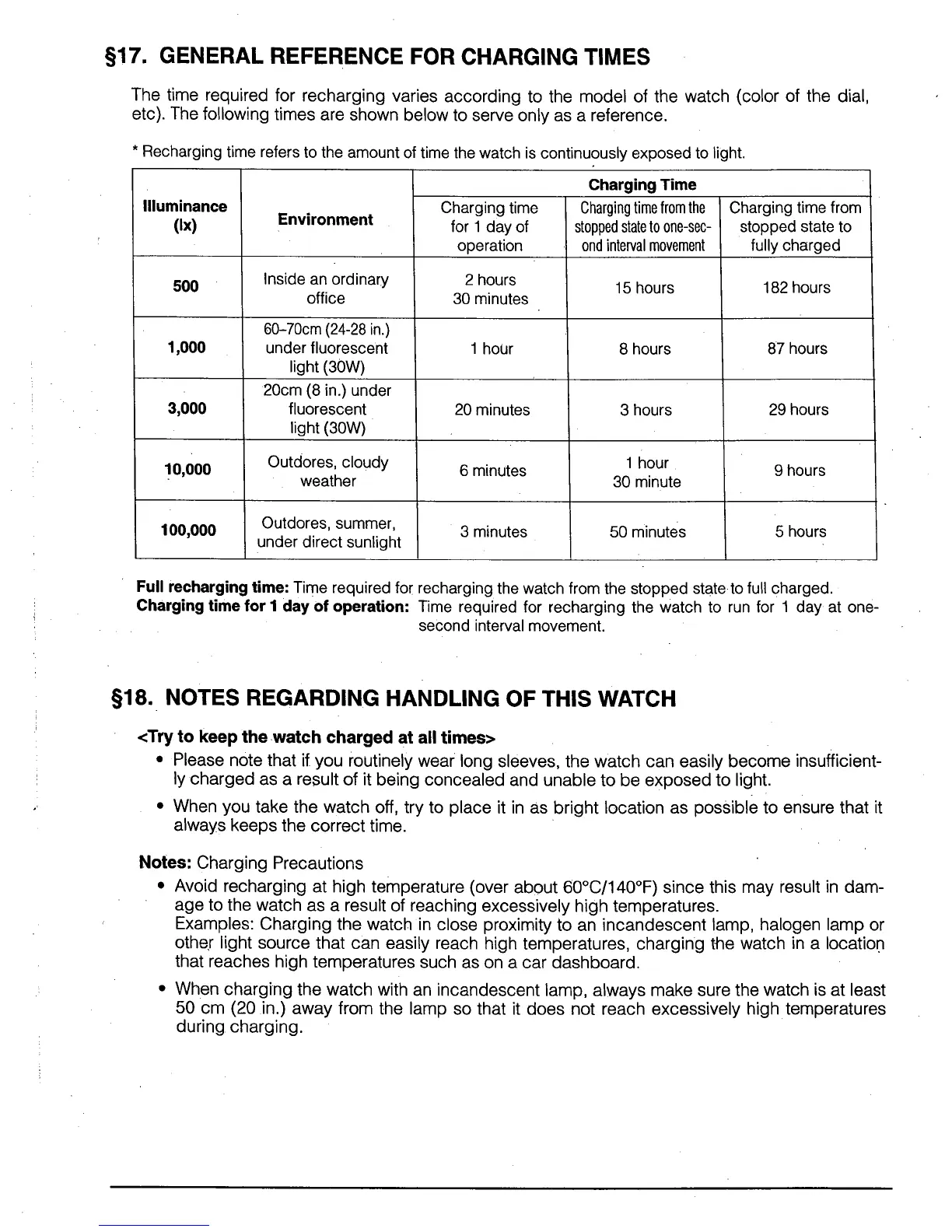 Citizen Quartz C650 - General Reference for Charging Times; Notes Regarding Handling of the Watch