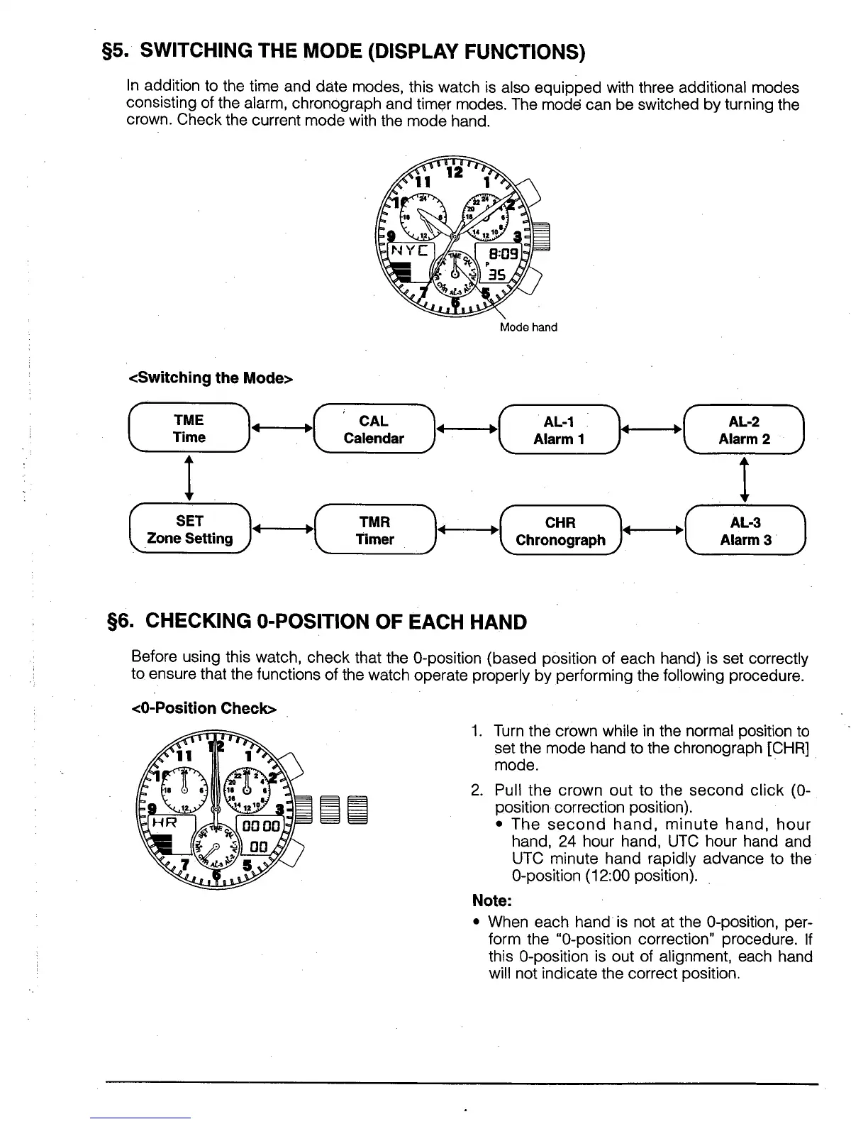 Citizen Quartz C650 - Switching the Mode; Display Functions; Checking 0-Position of each Hand