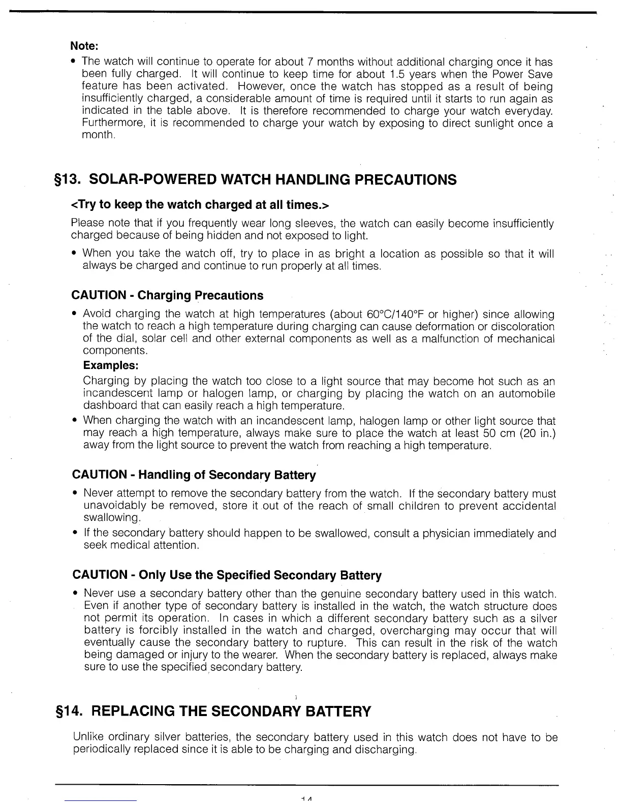 Citizen Quartz E870 - §13. SOLAR-POWERED WATCH HANDLING PRECAUTIONS; CAUTION - Charging Precautions; CAUTION - Handling of Secondary Battery