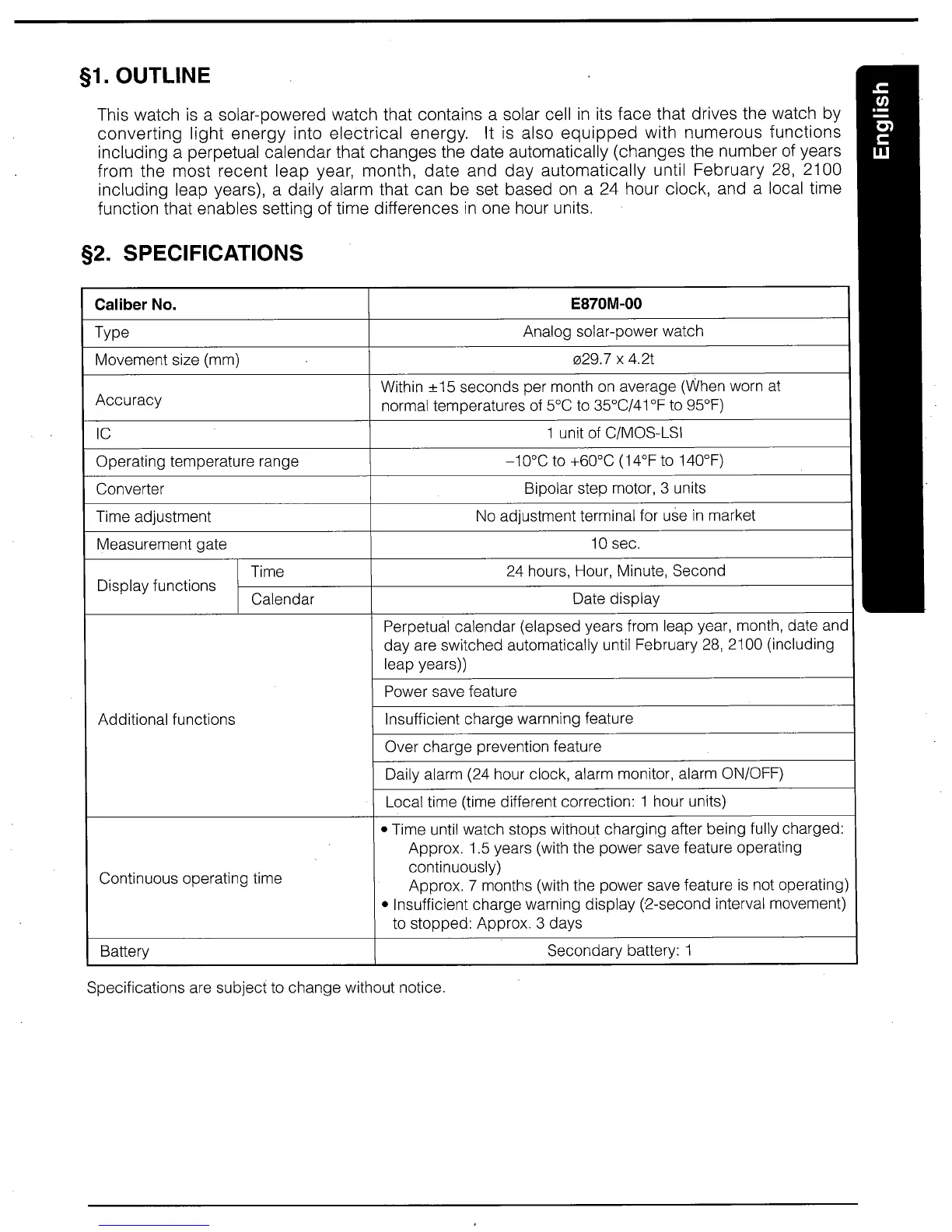 Citizen Quartz E870 - §1. OUTLINE; §2. SPECIFICATIONS
