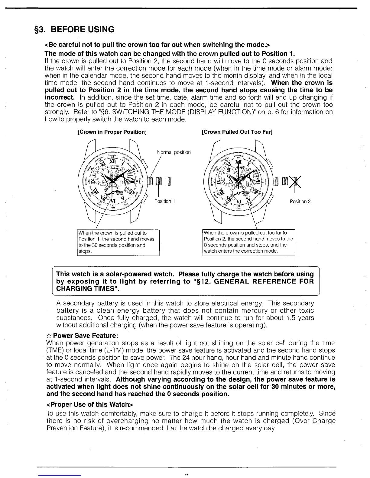 Citizen Quartz E870 - §3. BEFORE USING; CAUTION - Charging Precautions