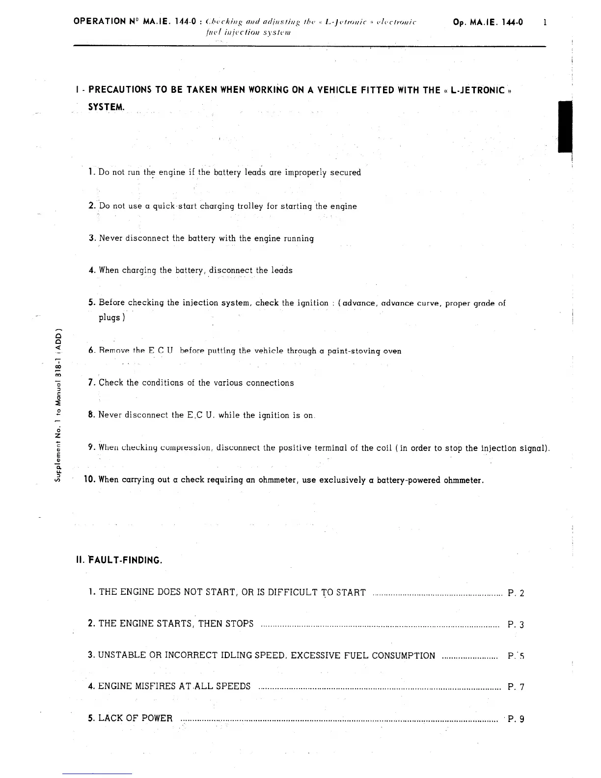 I - PRECAUTIONS TO BE TAKEN WHEN WORKII;(G ON A VEHICLE FITTED WITH THE (t L-JETRONIC n