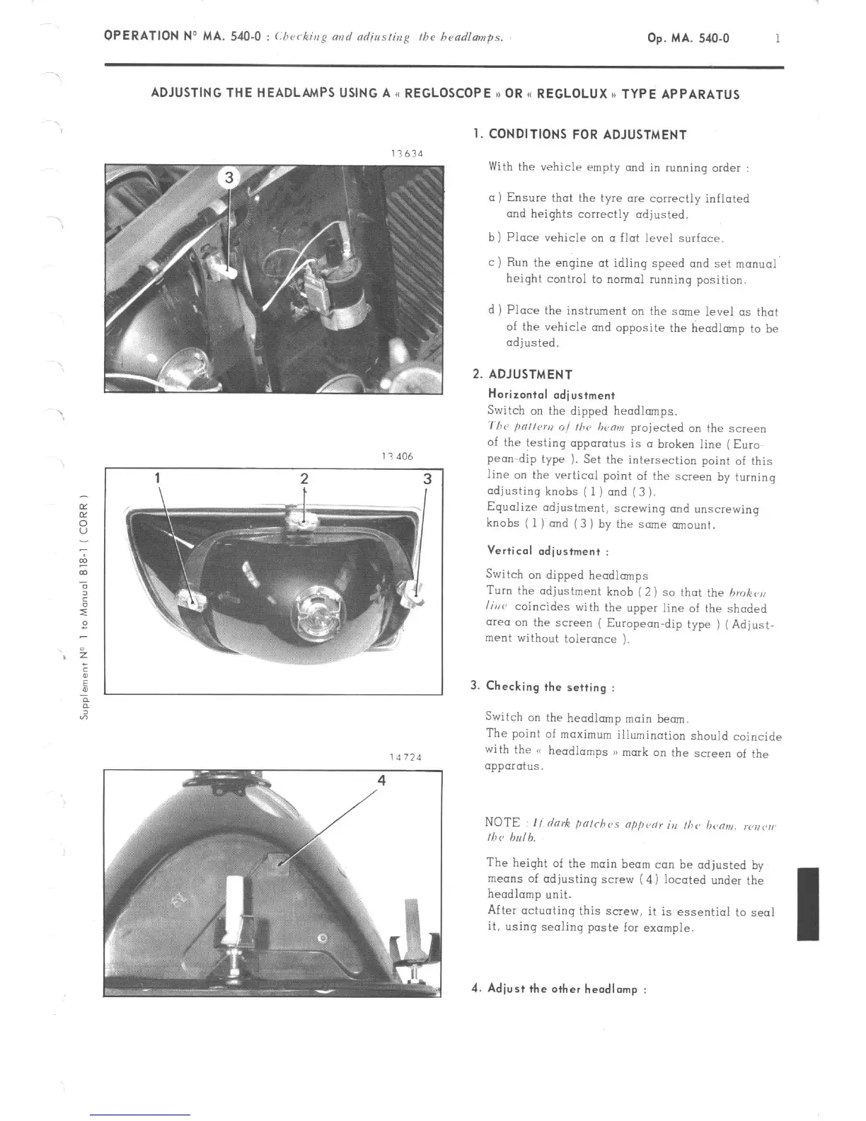 ADJUSTING THE HEADLAMPS USING A << REGLOSCOPE >> OR I< REGLOLUX n TYPE APPARATUS