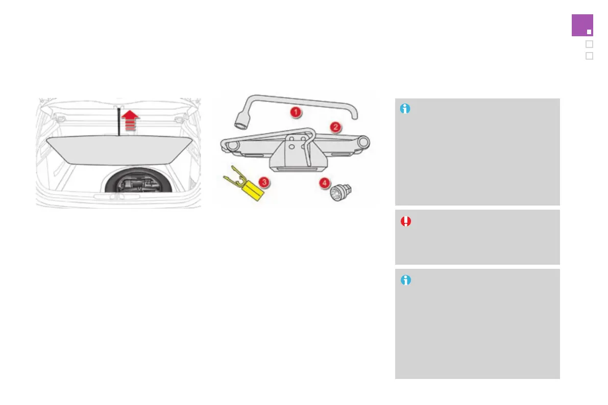 Procedure for changing a wheel with a damaged or punctured tyre for the spare wheel, using the tools supplied with the vehicle.