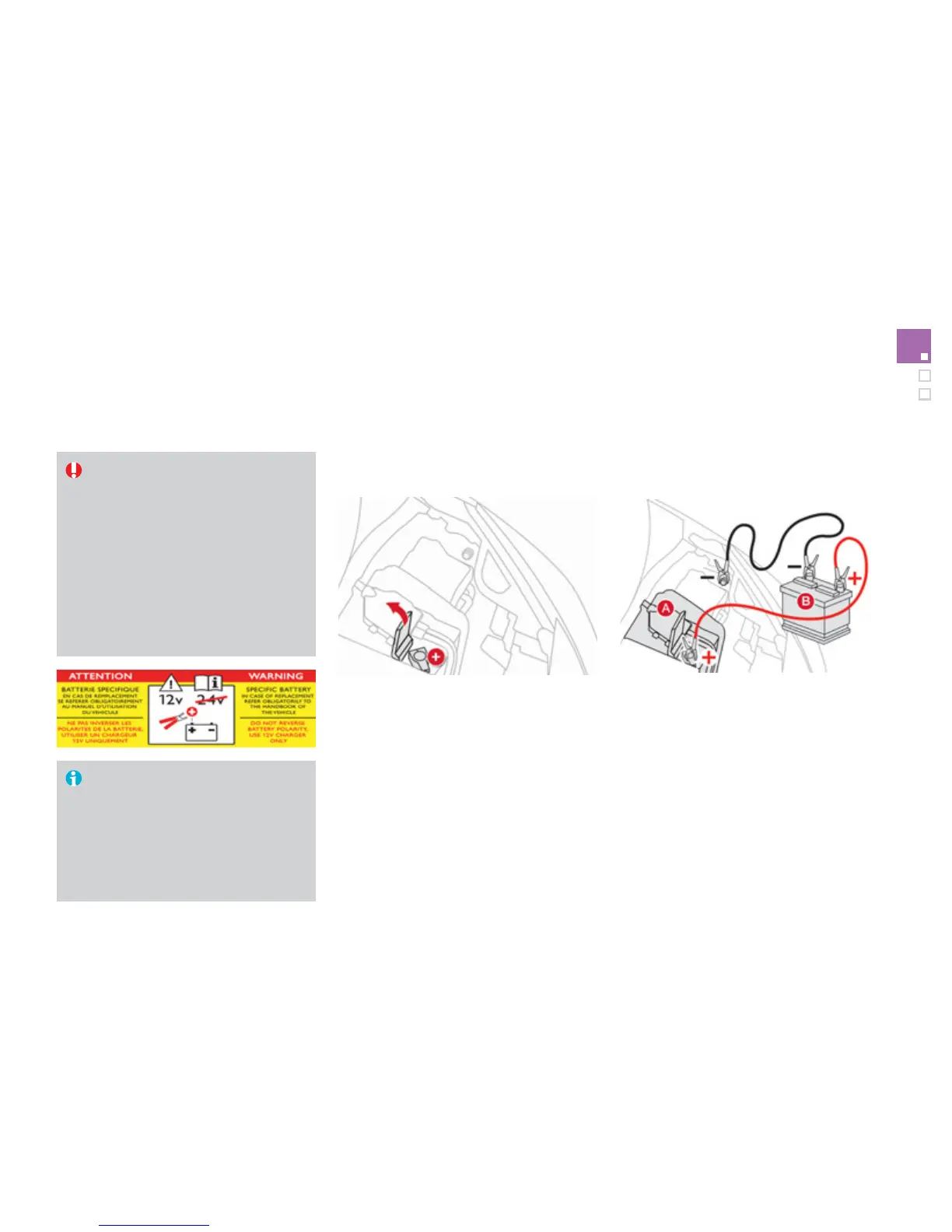 Procedure for charging your battery when it is flat or for starting the engine using another battery.