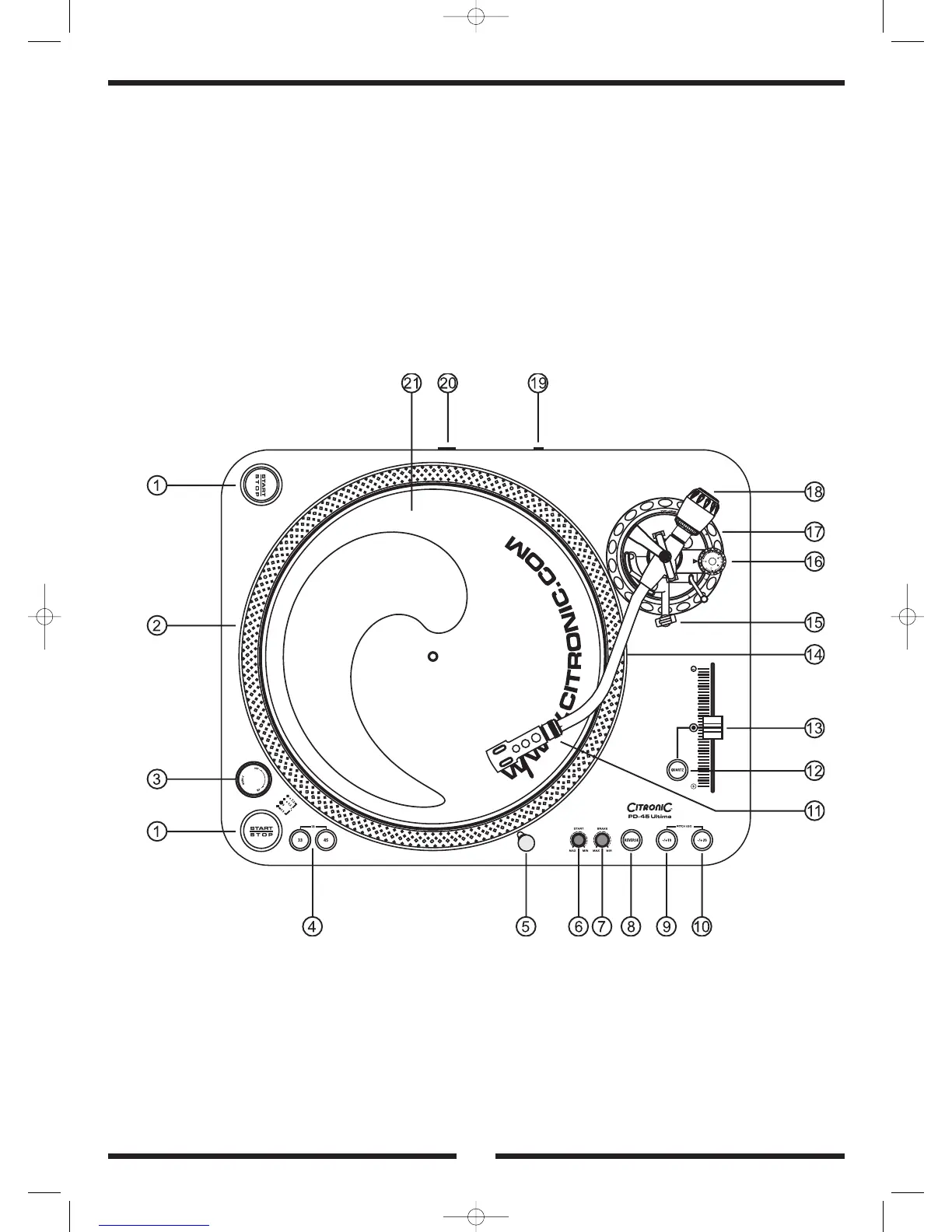 Rotary knob to adjust the starting speed of the Platter. Setting to